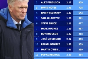 体育资讯11月26日讯 德国转会市场统计了英超主帅执教场次排名,莫耶斯728场排名第三,有望追赶弗格森和温格。