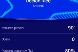 本场比赛赖斯发挥出色,传球成功率80%,跑动覆盖11.9km,赛后他当选欧冠官方评选出的本场最佳球员。