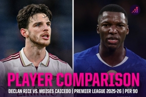 赖斯、凯塞多本赛季英超每90分钟数据: