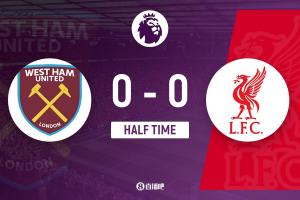上半场补时1分钟,西汉姆联0-0利物浦。