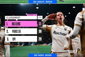 体育资讯12月1日讯 法甲第14轮,朗斯客场2-1击败昂热,14轮过后10胜1平3负31分位列法甲积分榜首位。