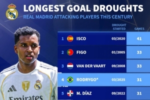 体育资讯12月5日讯 皇马在本轮西甲3-0完胜毕尔巴鄂竞技,罗德里戈替补登场仍未能取得进球,《转会市场》也统计了新世纪皇马攻击手的最长连续进球荒情况,伊斯科41场居首。