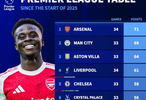 德转统计了自2025年以来英超积分榜。