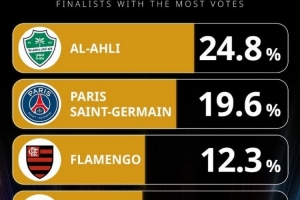 体育资讯12月10日讯 环球足球奖公布了2025年最佳男足俱乐部的投票情况,目前吉达国民24.8%领跑,巴黎、弗拉门戈二三位。