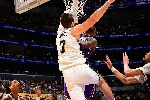体育资讯12月11日讯 今日NBA杯1/4决赛,湖人主场不敌马刺。次节行将结束之际,湖人进攻回合,詹姆斯持球冲到篮下,面对马刺中锋科内特,直接起跳完成单臂炸裂隔扣。