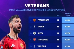 英超年龄30+球员身价榜:B费4000万欧居首,萨拉赫3000万欧次席