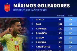 西班牙队史射手榜:比利亚59球居首,费兰23球、奥亚萨瓦尔22球