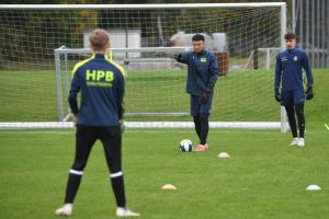 10月22日,在奥地利萨尔茨堡守门员学院训练场,李实(中)在指导学员训练。新华社记者 贺灿铃 摄
