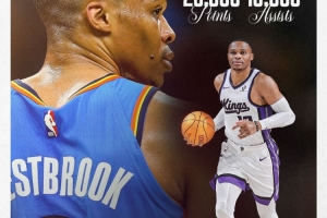 体育资讯11月16日讯 在昨天NBA杯国王VS森林狼的比赛中,威少生涯总助攻数突破10000次大关,成为继詹姆斯之后,NBA历史第二位生涯取得25000分和10000助攻的球员。