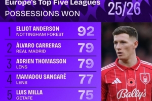 体育资讯11月22日讯 五大联赛战火即将重燃,数据机构squakwa也统计了本赛季至今的五大联赛球员赢得球权次数情况,诺丁汉森林中场埃利奥特·安德森居首。
