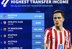 本季马竞通过出售加拉格尔和拉斯帕多里获得7750万欧,已经排名榜单首位;17/18赛季的毕尔巴鄂和18/19赛季的巴萨曾分别获得6500万和5155万排名二三。