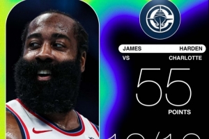 全场比赛,快船球星哈登出战35分钟,26中17,三分16中10得到55分3板7助攻1抢断。