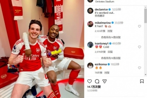 体育资讯11月24日讯 英超第12轮的北伦敦德比,阿森纳以4-1的比分大胜热刺。赛后,枪手中场赖斯在社交媒体上庆祝了这场重要的胜利。