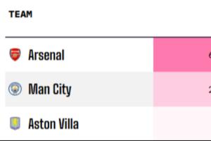 数据机构Opta的超级计算机给出了最新的英超夺冠概率,阿森纳68.17%依旧领跑,曼城25.65%,维拉4.84%,利物浦、切尔西、曼联等5队则不到1%,其余球队夺冠概率为0。