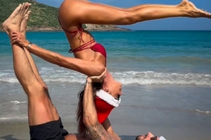 特拉普与未婚妻巴西超模古拉特头戴圣诞帽,在海滩上展示阿克罗瑜伽高难度动作,特拉普社媒晒出视频,配文:“我们的热带圣诞节传统,祝愿你与所爱之人共度美好时光,节日快乐!”