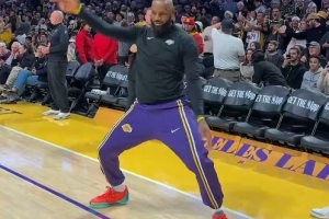GIF-詹姆斯赛前底线天勾命中 激情舞动庆祝