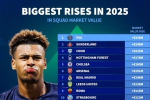 2025俱乐部身价涨幅榜:欧元