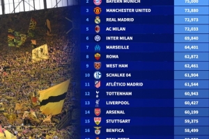 2025年欧洲俱乐部场均上座率排行:多特第1、拜仁第2、曼联第3