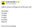 詹姆斯40岁数据:场均23.9分7.1板7.4助1.1抢断,场均2记三分,投篮命中率52%