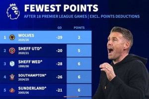 体育资讯12月29日讯 狼队在本轮英超焦点战1-2不敌利物浦,延续了本赛季的低迷表现。数据统计显示,他们也创下了英超历史前18轮同期最低积分。如果按照当前的拿分情况,他们将最终仅积4分,而英超历史单赛季最低总积分为11分。