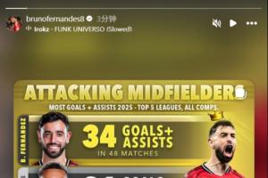 体育资讯12月29日讯 B费更新社媒,晒出自己在2025年五大联赛进攻型中场进球+助攻数据的排名,他本人以35次进球+助攻位列榜首!
