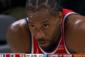 比赛末节8分56秒,小卡上篮时被小克莱顿扫到了面部打出了血,但是爵士居然挑战成功了,结果变成了小卡被帽、快船出界;