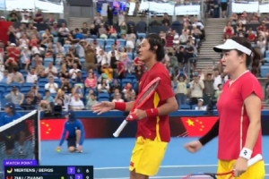 体育资讯1月3日讯 网球联合杯悉尼赛区B组混双决胜,朱琳/张之臻在决胜盘抢十,以2-1逆转梅尔滕斯/贝尔赫斯,中国队大比分2-1击败比利时队,小组首战告捷。