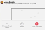 #西班牙人0比2巴萨# 据统计,乔安-加西亚成为自2023年11月对阵皇家社会的特尔施特根以来,首位在西甲单场完成6次扑救且未失球的巴塞罗那门将(同样是6次)。