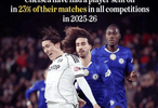 这也意味着切尔西本赛季截止目前有23%的各项赛事都出现过场上只剩10人迎战的局面。
