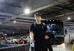 赛前,杨瀚森一身黑色休闲装&身背粉书包步入勇士主场。