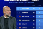 在本轮英超焦点战曼城客场vs热刺前夕,德转统计了瓜迪奥拉带队输球场次榜。