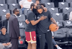 哈登和德罗赞赛前拥抱示意并小声低语。