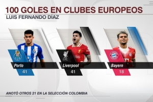 数据统计显示,路易斯·迪亚斯在旅欧期间俱乐部赛事已经打进了100粒进球,其中波尔图41球,利物浦41球,拜仁18球。